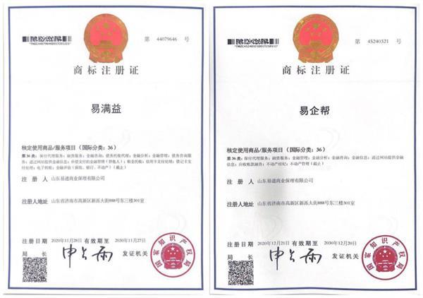 近日,国家知识产权局商标局网站发布公告,易通保理申请注册的“易满益”“易企帮”公告期满,获得由国家知识产权局颁发的国家商标注册证书。